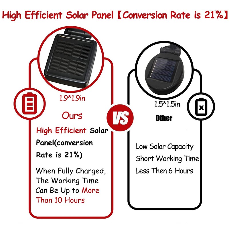 - Solar Powered: Owered by solar panel,no manual charging needed, the light can be fully charged within 4-6 hours on a sunny day. Fully charged, it can last up to 8-15 hours at night.
