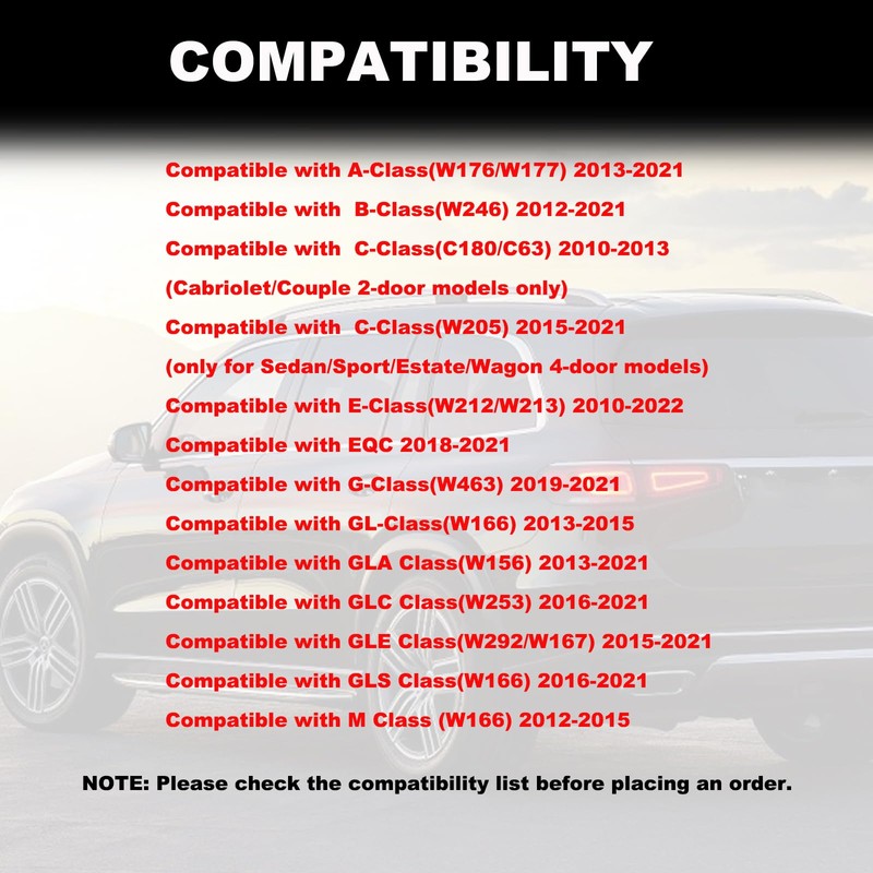 • Applicable mpdels - Compatible with A Class(W176/W177)2013-2021, B Class(W246)2012-2021, C Class(C180/C63)2010-2013, C Class(W205) 2015-2021, E Class(W212/W213)2010-2022, G Class(W463)2019-2021, GL Class(W166)2013-2015, GLA Class(W156)2013-2021,GLC Class(W253)2016-2021, GLE Class(W292/W167)2015-2021, GLS Class(W166) 2016-2021