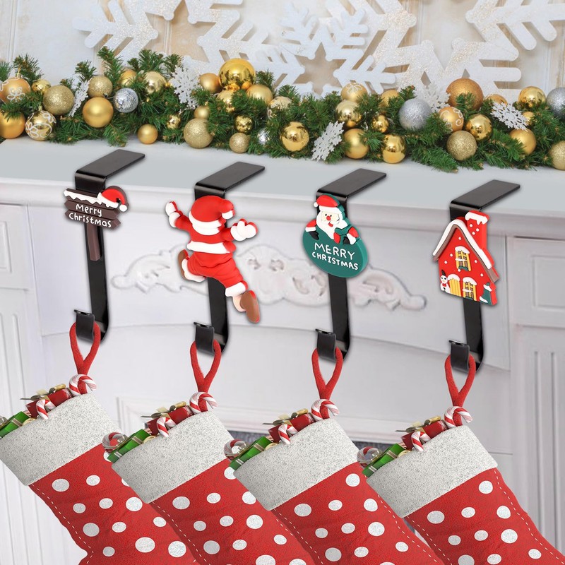 4pcs Christmas Stocking Holders, Santa Claus House Stocking Holders for Mantle Fireplace Stocking Hangers Non-Slip Stocking Hooks for Xmas Holiday Party Decorations
