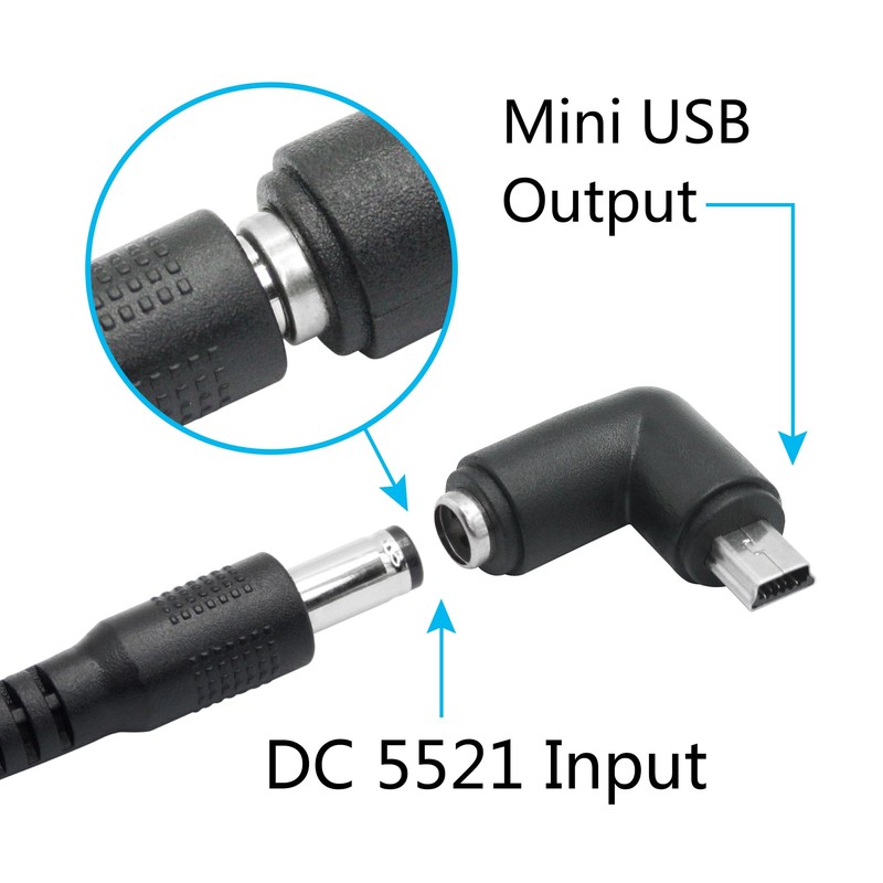 - 【90 Degree Right Angle】The unique 90 degree dc 5521 female to mini usb male plug connector, solve limited connectivity between devices, also ok be easily go through the narrow gap, convenience for you while extending the lifespan.