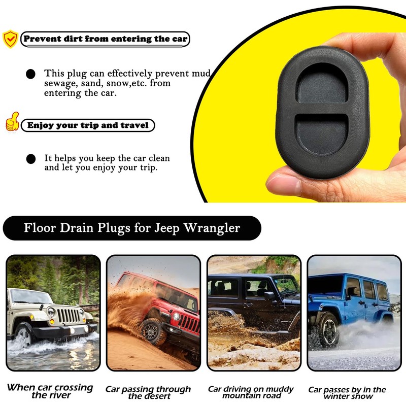 Broken or missing plugs will bring water, sand and other debris into the car floor, causing the floor to be messy and damp. You may need a new replaceable drain plug for your Jeep.