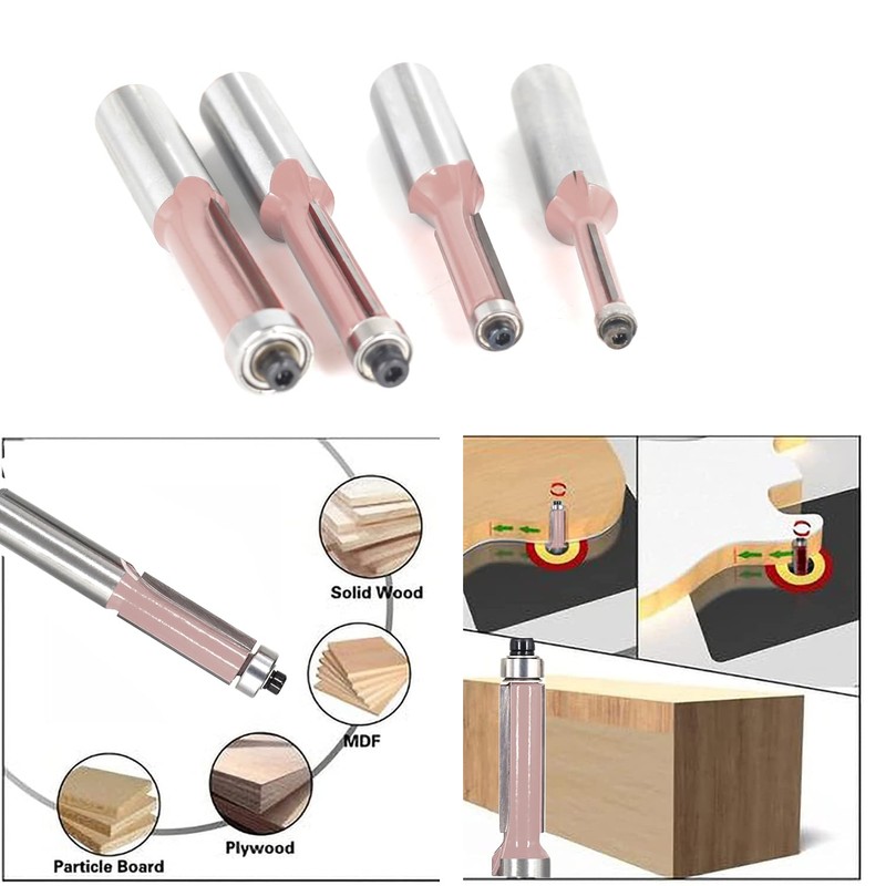 4Pcs Flush Trim Router Bit Set 1/2 Inch Shank, Carbide Tipped Top Bearing Template Flush Trim Router Bit, Flush Cut Router Bit, Straight Flush Trim Bit, for Wood Edge Trimming