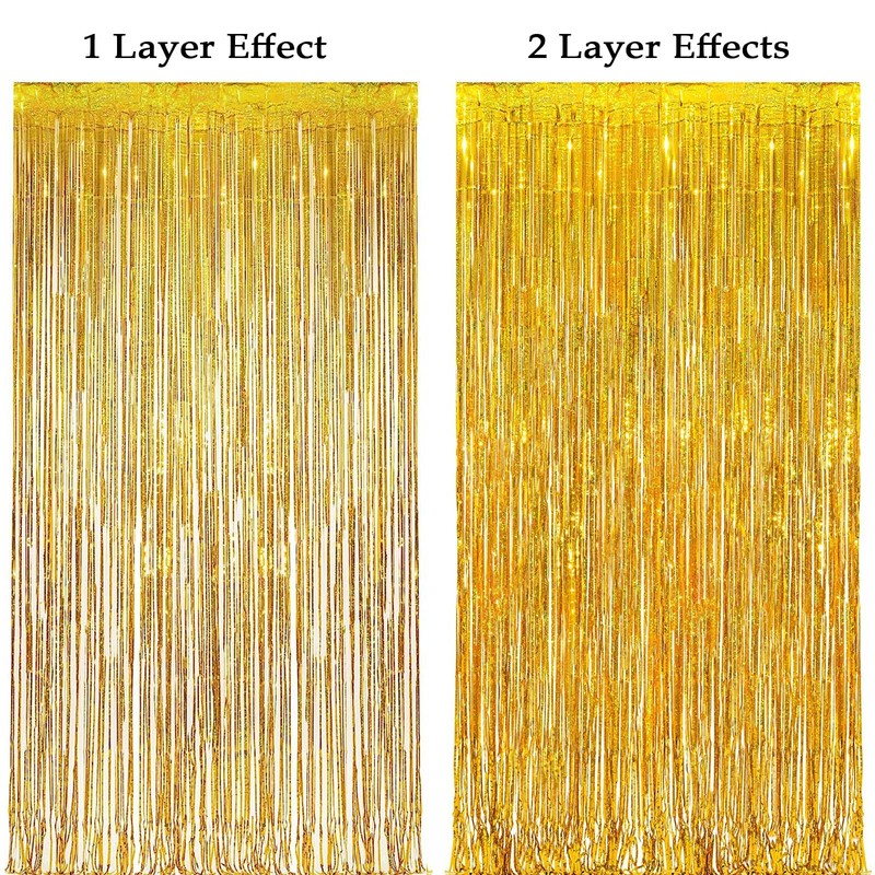 - 🎁 BUY WITH CONFIDENCE l 100% SATISFACTION GUARANTEE - Don't hesitate to contact us if you have any quality issues, and we'll send a replacement or provide a satisfied solution with ZERO RISK TO YOU. 🎀 The foil fringe curtains are good for serving as party decorations, photography curtains and so on, allow you to take charming or interesting photos with family or friend. Gold streamer backdrop great for disco party decorations, graduation backdrop, photo booth backdrop, Anniversary
