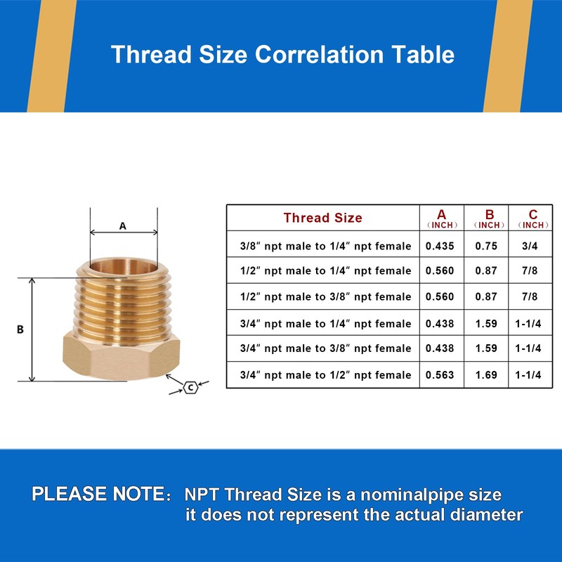 - Functionality: Designed for connecting male and female pipes of different diameters, the hexagonal shape allows for easy installation or removal using a wrench. Max pressure: 150 PSI; temperature range: -65°F to +250°F