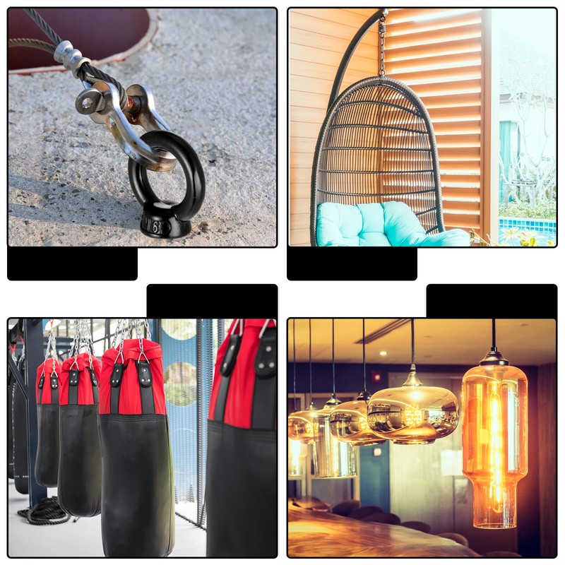 - 4-Piece Set for Versatile Applications: Packed in a convenient bag, the set includes 4 black ring shoulder eye bolts, providing ample quantity for multiple projects. Ideal for suspending string lights, chandeliers, canopies, or securing ropes and cables, they serve as essential tools for home improvement, construction, or outdoor decor needs