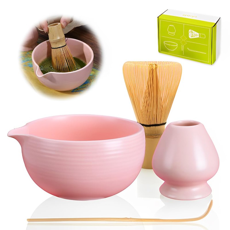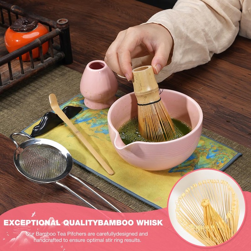 4pcs Matcha Whisk Set, Matcha Kit, Matcha Whisk and Bowl, Matcha Whisk Holder, Spout, Matcha Tea Set, Pink Matcha Set for Matcha Tea Ceremony