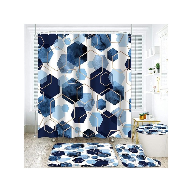 4Pcs Sky Blue Geometric Shower Curtain Set with Navy Blue Abstract Art, 12 Hooks, Bath Mat and Rugs