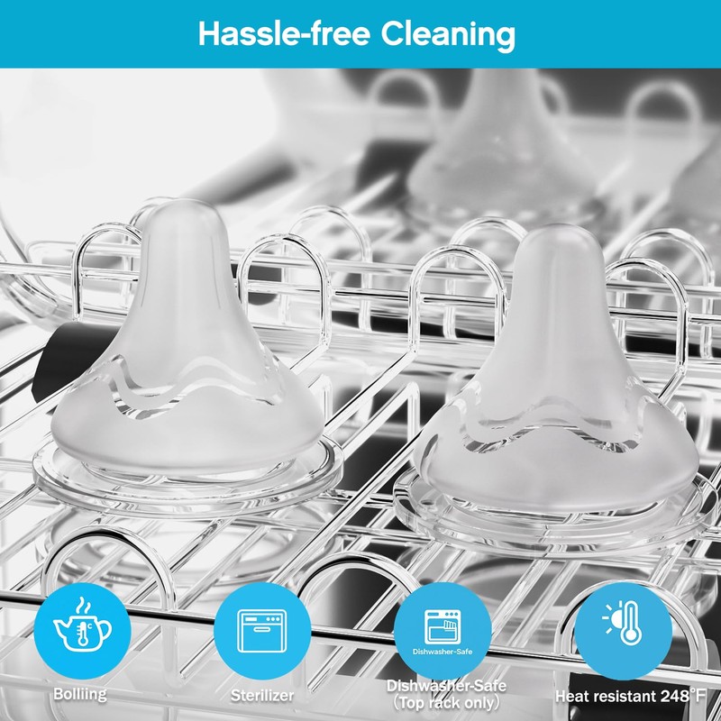 - 【Easy to Clean】:Clean up is a breeze! Simply sterilize the nipple using a steam sterilizer or boiling water. Safe for use in dishwasher (top rack only), electric and microwave sterilizers or boiling water. For optimal hygiene, we recommend replacing it every four weeks.