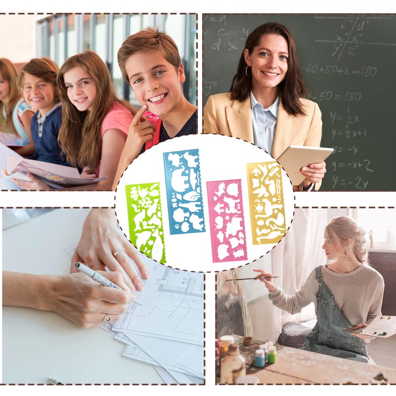 This set of 4 multifunctional cartoon rulers offers a practical combination of measurement and creativity. Each ruler features smooth plastic construction with precise cut-outs that can be used as stencils. With designs ranging from geometric shapes to animal patterns, the rulers serve as versatile drawing templates for sketching, painting, or DIY projects. They are easy to carry, store, and reuse, making them suitable for offices, schools, or home craft activities. These rulers can function as stencils for painting, plastic stencils, or an animal stencils set, offering flexibility and artistic inspiration.