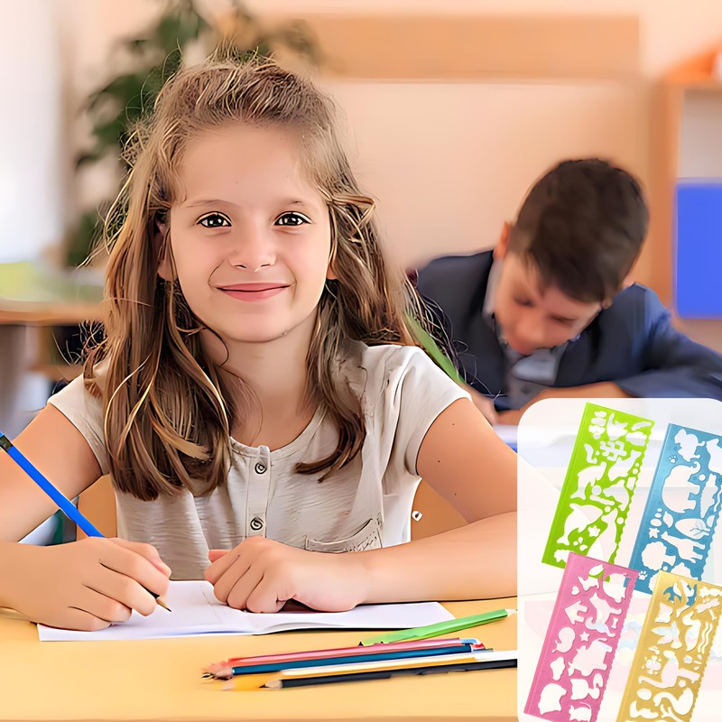 Each ruler integrates measuring, sketching, and pattern drawing. The design includes stencil cut-outs for animals, geometric shapes, and decorative borders to enrich creative work.