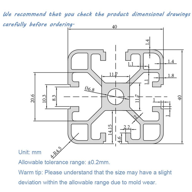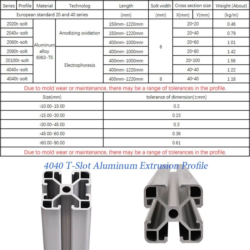 - 👍40 series 4040 aluminum extrusion profile T-slot made of 6063-T5 material, smooth surface, strong structure and long service life. Compatible with all Series 40 fasteners and accessories.