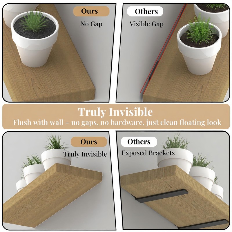 - 【Invisible Floating Shelf Bracket for Sleek, Modern Aesthetic】Say goodbye to bulky L shaped or pipe brackets. Crafterspirit heavy duty floating shelf bracket are completely hidden inside the shelf, creating seamless, minimalist design. Once mounted, the hidden shelf brackets remain invisible from every angle, enhancing modern interiors. Perfect for home office, living room, kitchen and even outdoor patios. Keep shelves neat, stylish, and maximize space while maintaining clean, contemporary look.