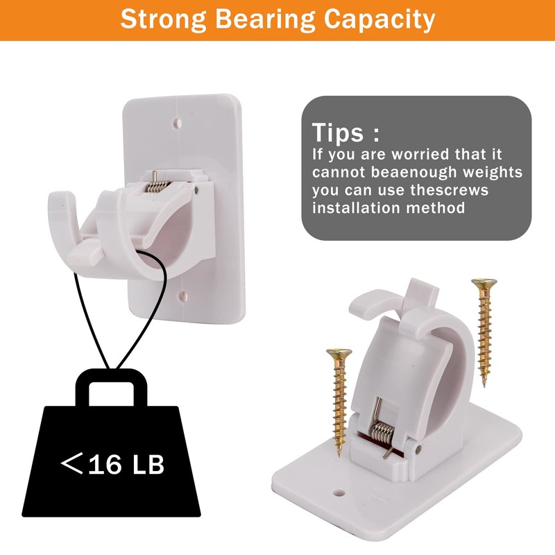 - Practical design: The sticky curtain rod holder has a weight capacity of 16 pounds, if the curtain rod and curtains are too heavy please use several more products to support or use screws, it can support hanging multi-purpose round rods less than 40MM.