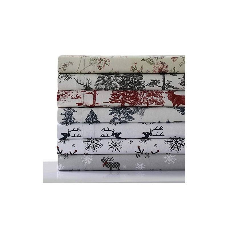 - Features: Made from cotton flannel Plain weave Weighs 200 gsm Printed holiday and novelty pattern Extra deep pocket sheets Available in twin, twin XL, full, queen, king, and California king Double-needle hem Oversized flat sheet 24-inch fitted sheet pocket depth Fully elasticized fitted sheet Prints available in Toile, Snowflakes, Deer, Buck and Floral patterns Materials: 100-percent cotton