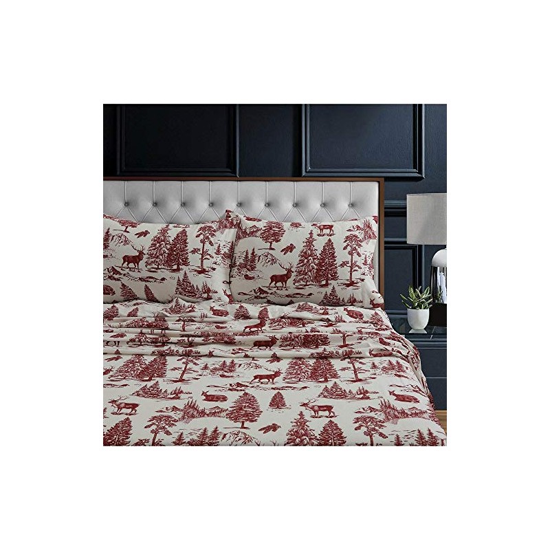 - 4piece Novelty Toile Theme Rust Red Bedding Sets King French Country Holiday Hills Trees Buck Deer Print Flannel Sheets 200-Gsm Cotton Deep Pocket Wildlife Animal Print Traditional Nordic Fitted Sheet