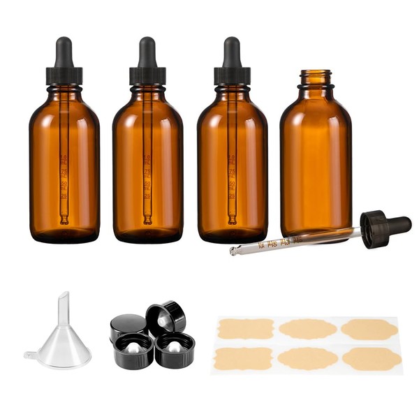 - Package Includes: 4pcs 4oz (120ml) Boston Round Glass Bottles + 4pcs Eye Droppers + 4pcs Phenolic Cap+1pcs Funnel + 6 Labels. 4oz Bottles with Droppers and 4oz Bottles with Caps can Meet Your Different Needs.