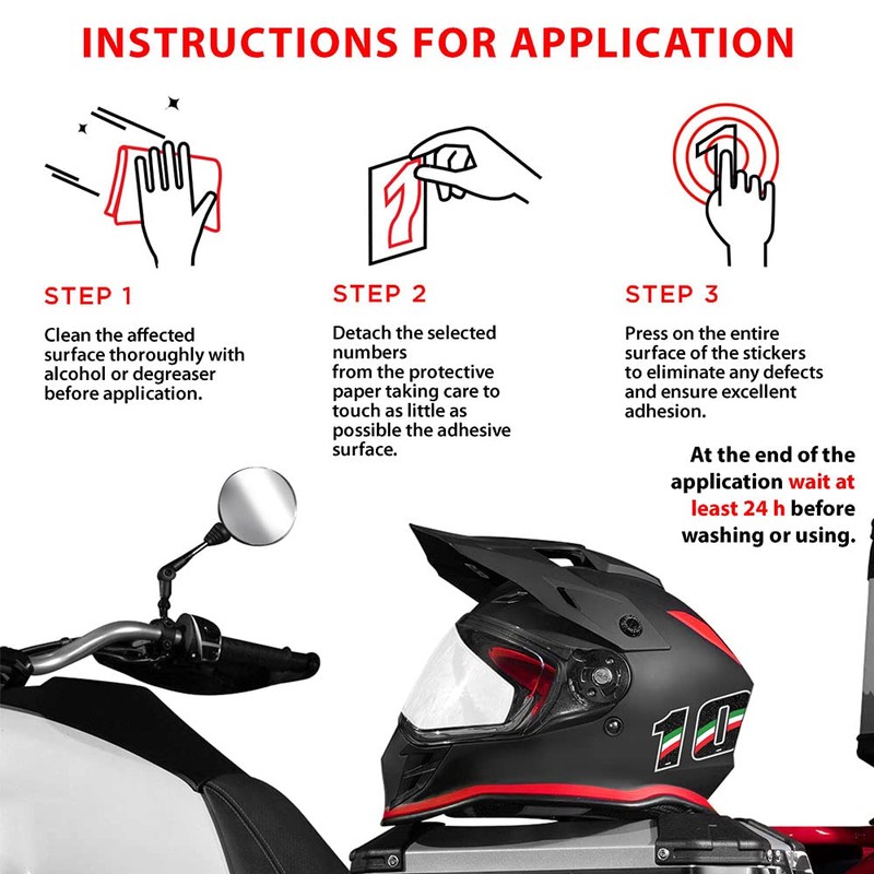 Selbstklebende Zahlen, um Ihr Motorrad zu personalisieren und ihm einen rennenden Touch zu verleihen. Garantierte Haftf?higkeit, hervorragende Best?ndigkeit ber die Zeit. Pr?zise Details und leuchtende Farben. Gr??e: 65 x 85 mm.