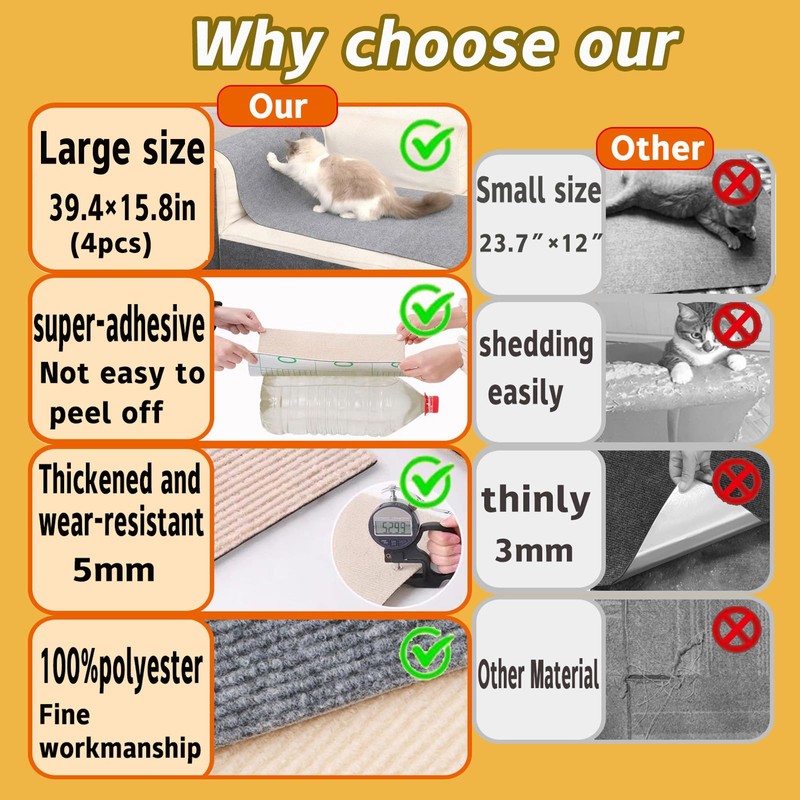 - 【High-Quality Safe Material】: Our cat scratching pads is made of high-quality environmentally friendly felt material, the surface of the scratching prongs design, which can attract cats to use it better, the material is safe and reliable, not easy to tear, can be used for a long time.it can be pasted and reused, won't damage the surface of your product.