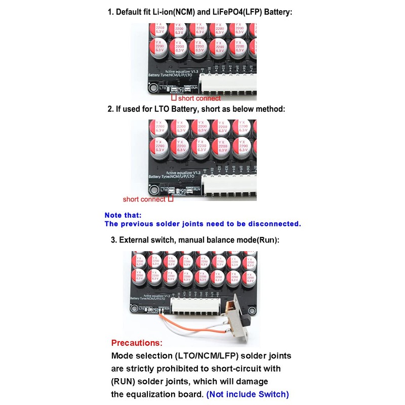 - La corriente silenciosa es de aproximadamente 7 mA, y se recomienda utilizar la capacidad de la batería entre 30-200 AH/por equilibrador. Las baterías de alta capacidad se pueden conectar en paralelo con múltiples ecualizadores.