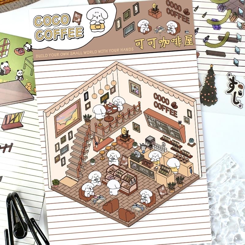 4Sets DIY 3D House Stickers Set Make Your Own Sticker Supermarket Coffee Shop Restaurant Bookstore 3D House Sticker Set Funny Cartoon Scene Stickers for Relief Stress Pass The Time (A)