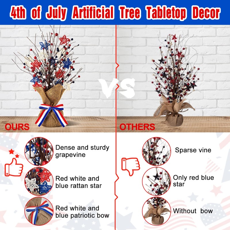 - 4th of July Patriotic Table Tree: Independence Day table tree designed with red white and blue colors, 20inch patriotic artificial table tree consists of cement base and vines and assorted artificial berries and stars shaped rattan balls in America flag colors, star and round which will add an extra touch to your home