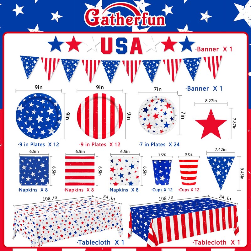 - Celebrate Independence with Style: Elevate your 4th of July celebration with our patriotic package, featuring 24pcs 9” American Flag paper plates(mix 2 designs), 24pcs 7” plates, and 24pcs enchantingly designed 6.5” x 6.5” paper napkins(mix 3 designs), ensuring your party decor resonates with the spirit of freedom and patriotism. Our set also includes 24pcs 9oz paper cups(mix 2 designs), 2pcs vibrant banners(mix 2 designs), and 2pcs expansive 54” x 108” tablecloths(mix 2 designs), making your Independence Day unforgettable.