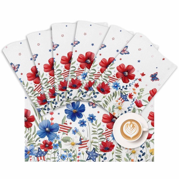 4th of July Placemats Red Blue Flowers Butterfly Place Mats for Dining Table Patriotic American Flag Independence Day Washable Table Mats for Kitchen Dining Decorations Set of 6
