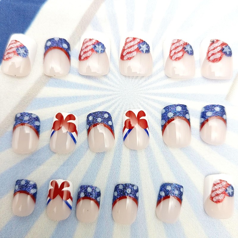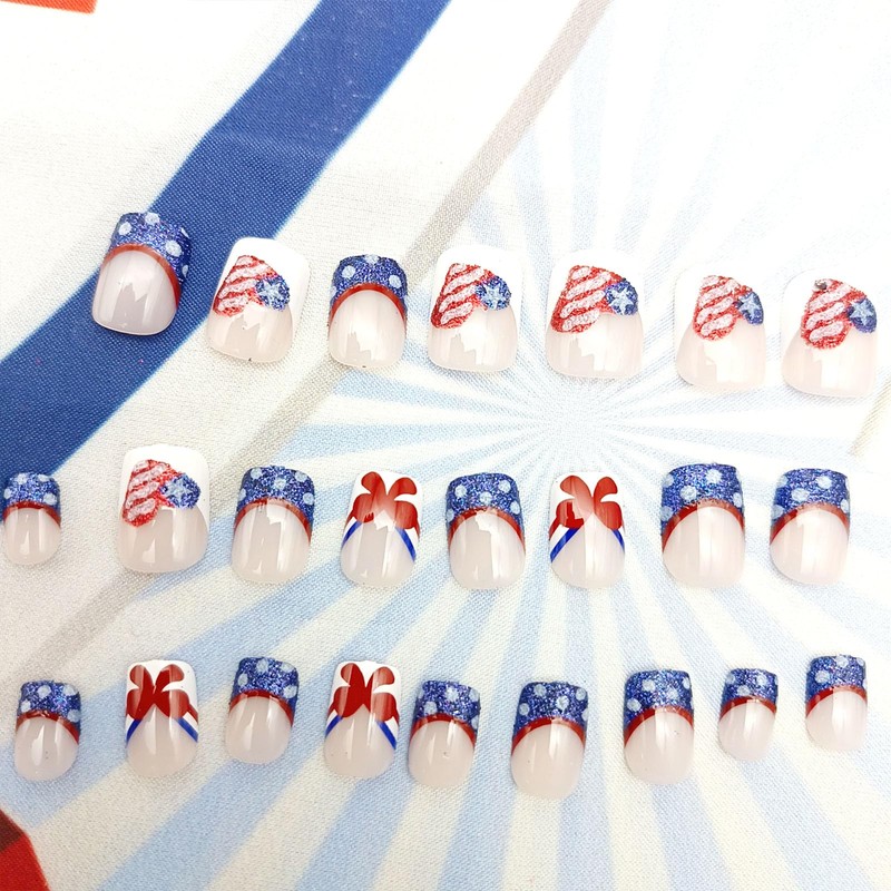 4th of July Press on Nails Independence Day Fake Nails Heart Flag Glitter Glue on Nails Red Bow Blue White French Tip False Nails Short Square Nails Press ons Artificial Stick on Nails for Women 24Pcs