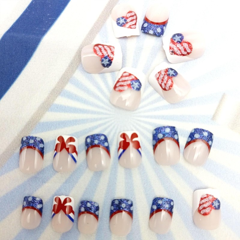 - Package: A box of 24 pieces of 4th of july press on nails kit 24 pcs of jelly glue 1 small wooden stick 1 nail file and alcohol bag. Our set does not include glue.(Glitter is easy to fall off, please apply protective glue)