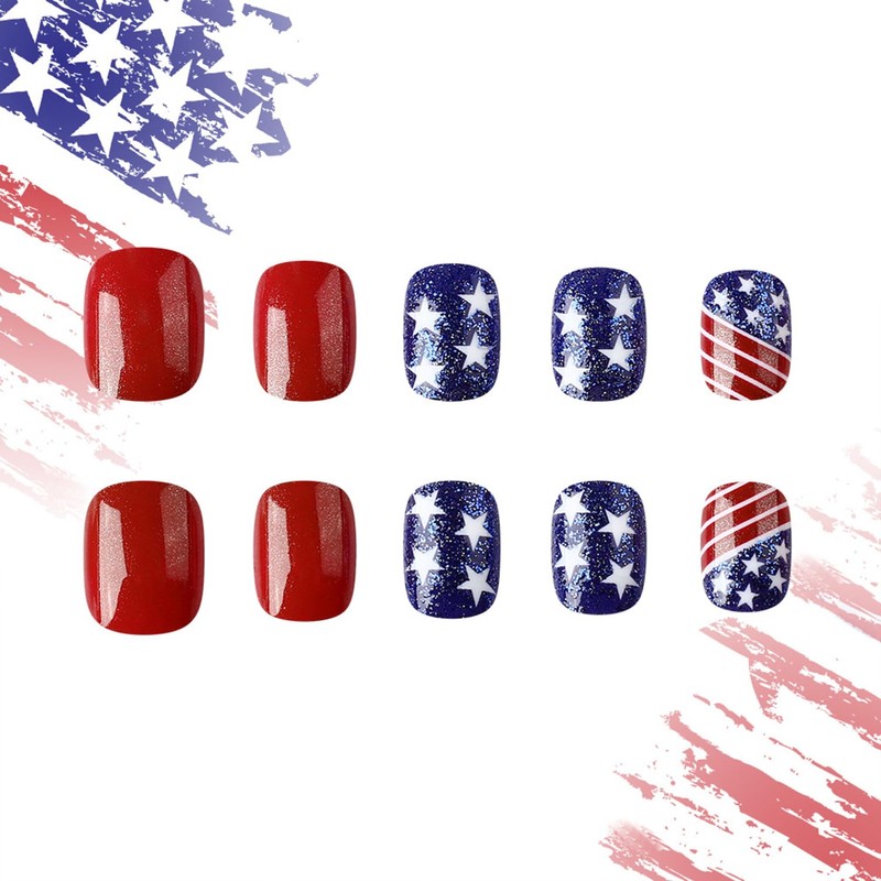 • 4th of July Glue on Nails Kit: Package with 24 pcs short square artificial finger nails, 1 sheets jelly glue stickers, 1pcs nail file, 1pcs wooden stick. 12 sizes fake nails can reusable, suitable for different size of nails