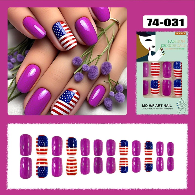 24Pcs fourth of July press on finger nails ,purple press on nails,party, nail salon, holiday,USA independence Day nail art decorations