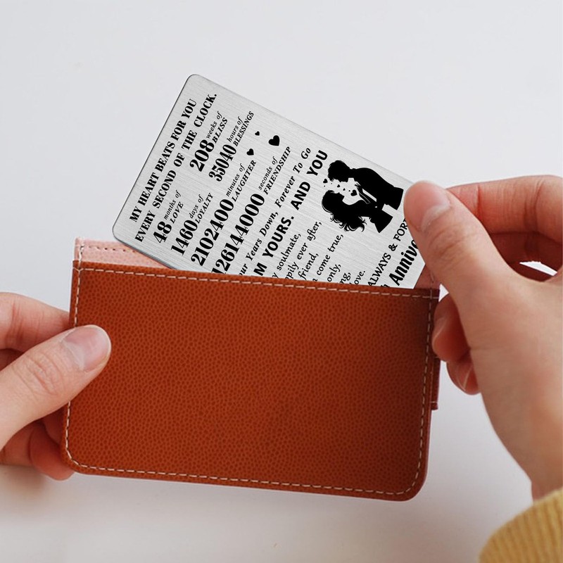 • 4 Year Anniversary Engraved Wallet Card - The meaningful card size about 3.37"x2.12"x0.02", so perfect in any wallet. An unique gifts for your wife gift idea, greeting card