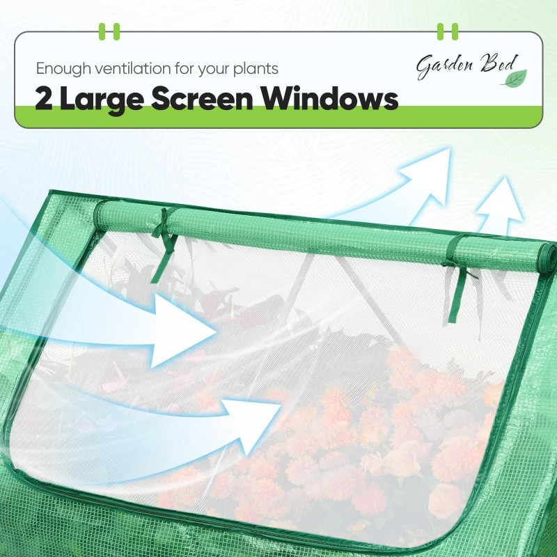 Prevent animals from entering: Tall raised garden bed can keep small pets out of your planting zone, such as chickens, puppies, and rabbits. Besides, the mini greenhouse cover has 2 big screen windows, which can also keep birds away from your plants, you can totally enjoy all your fruits.