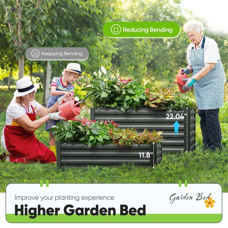 Deepened Height: Raised beds for gardening are 22.04" tall, while normal beds are only 12". You can add multiple materials into the metal planter box such as scrap wood, peel of fruits, fallen leaves and branches. Create nutrient-rich soil and, at the same time, get rid of waste from plants or food. Growing many deep-root vegetables or fruits is perfect.