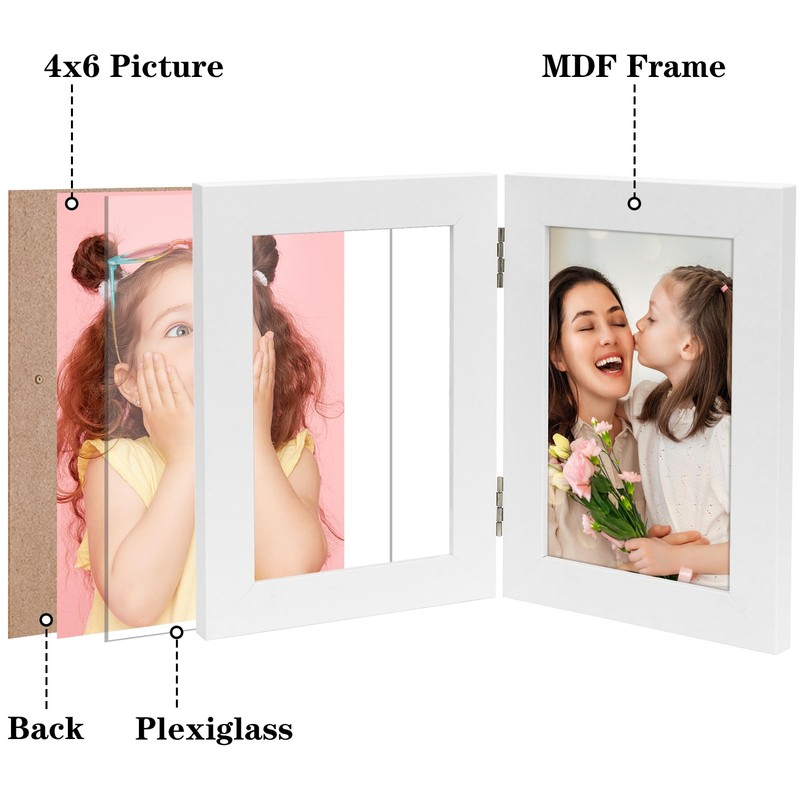 - Material: The 4 by 6 white folding tabletop photo frames are made of MDF material, and the high definition plexiglass that give clear views of your pictures and preserve your photos for many years. Please remove the protective film on both sides of the plexiglass before use.