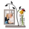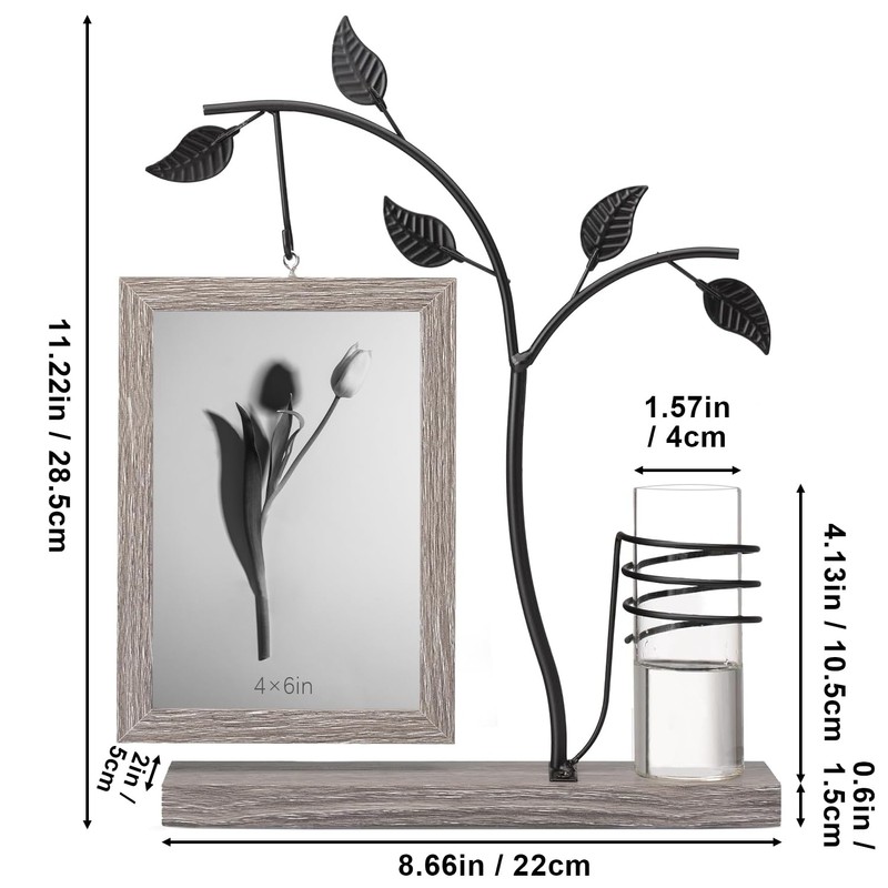 - 【Elegant Design】 The photo frame adopts a light gray wooden frame and the black metal bracket is paired with three leaf-shaped decorations, which not only increases the overall aesthetics, but also makes the product more design-friendly. The small vase part can be replaced with green plants or flowers according to personal preferences and seasonal changes.