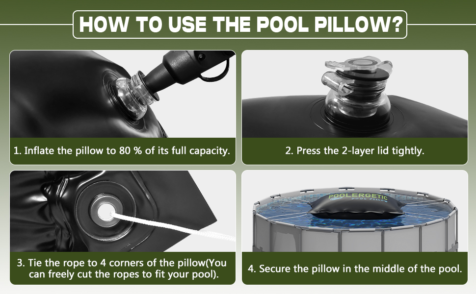 • DOUBLE VALVE DESIGN: The double boston valve is designed to be airtight and easy to use. The pool pillow for winterizing works with most inflatable pumps/blowers. Inflate the pool pillow to 70-80% of its capacity (do not over-inflate). After inflation, press the secondary valve firmly to help maintain air retention