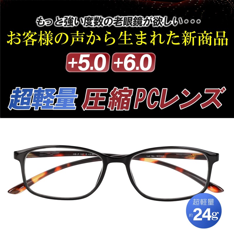 - ✅【強度数対応】通常度数+3.5位までは何処でも手に入りますが、それ以上の度数はなかなかありません。60~70代以上を中心に+5.0+6.0の強い度数の老眼鏡をご用意しました。老眼鏡は度数が強くなるとレンズが厚く重くなります。 これを避けるため屈折率の高いPC圧縮レンズを採用し、わずか24gまで軽量化しました。 【レンズ素材】PC(+5.0+6.0)/アクリル(+1.0+2.0+3.0+4.0) ✅【ジャパンフィット】バネ丁番フレームで 日本人の顔幅や鼻にフィットするように設計したフレームで快適な掛け心地です。フィット感抜群!!かけているのを忘れるくらい軽いかけ心地です。