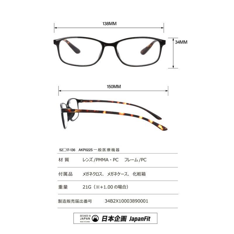 - ✅【仕様】 サイズ:幅138X奥行15X高さ3.4cm 【度数】 +3.0 【重量】 21g(※+1.0の場合)。 【カラー】 ブラックデミ