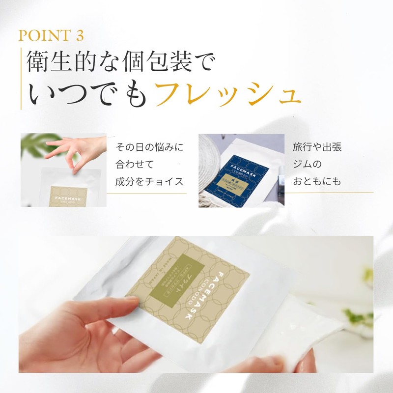 - ✅【鮮度そのまま!個包装タイプ】個包装タイプのフェイスマスクなので、いつでもみずみずしい鮮度を実感できます。衛生面を考えた使い切りタイプのフェイスマスクなので、出張や旅行などの際にも持ち運びしていただけます。