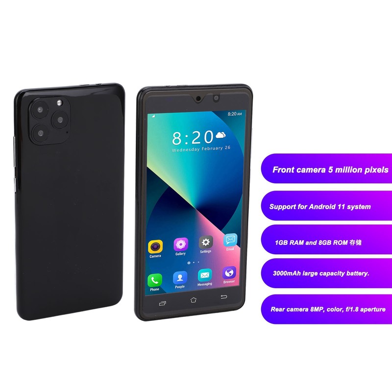 1、Dual Cards Dual Standby: Smartphone with 1GB RAM and 8GB ROM storage, 3 independent card slots for 2 SIM card slots, 1 memory card slot (not included, up to 128GB). 2、3G Mobile Phone: This is a 3G smartphone that supports dual 3G networks, it can work with for GSM operators like for Tmobile, for Metro PCS, etc. 3、3000mAh Battery: The smart phone uses a lithium battery type, 3000mAh capacity, high capacity battery, long battery life, to meet your all day use. 4、HD Camera: The front camera of the mobile phone is 5MP, f/2.0 aperture, fixed focal length, and the rear camera is 8MP, color, f/1.8 aperture. 5、Touch Screen: Smartphone for Android 11, 5.5in touch screen, high definition resolution 1280x2320, high sensitivity, simple and smooth operation.