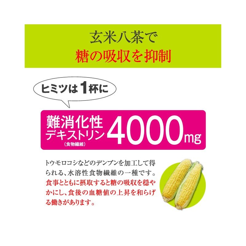 - 「食後の血糖値が気になる方の玄米八茶」は8種類の素材をブレンドしたお茶に関与成分である難消化性デキストリンを配合した特定保健用食品です。