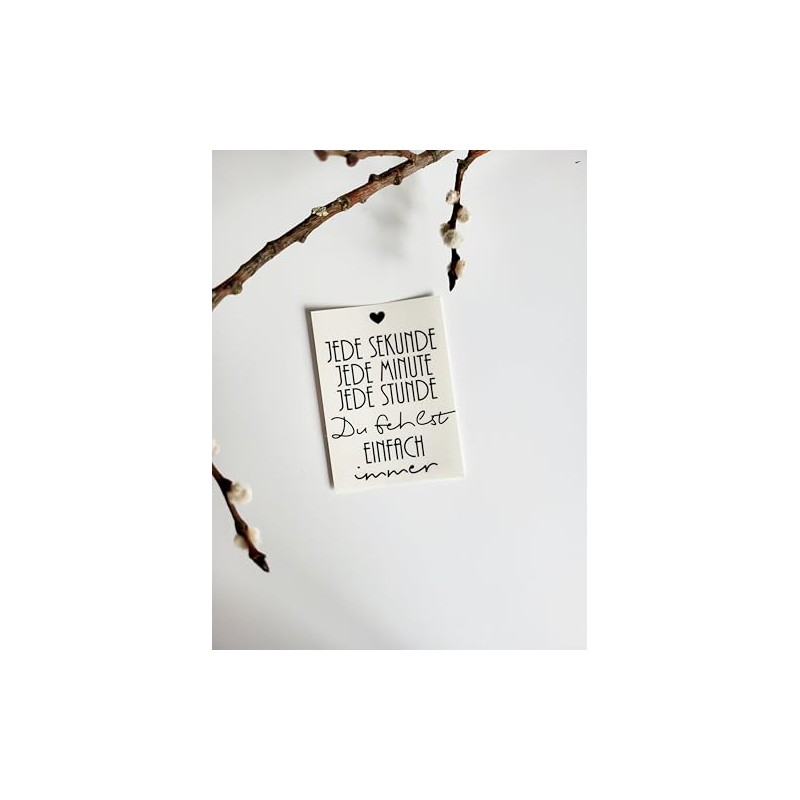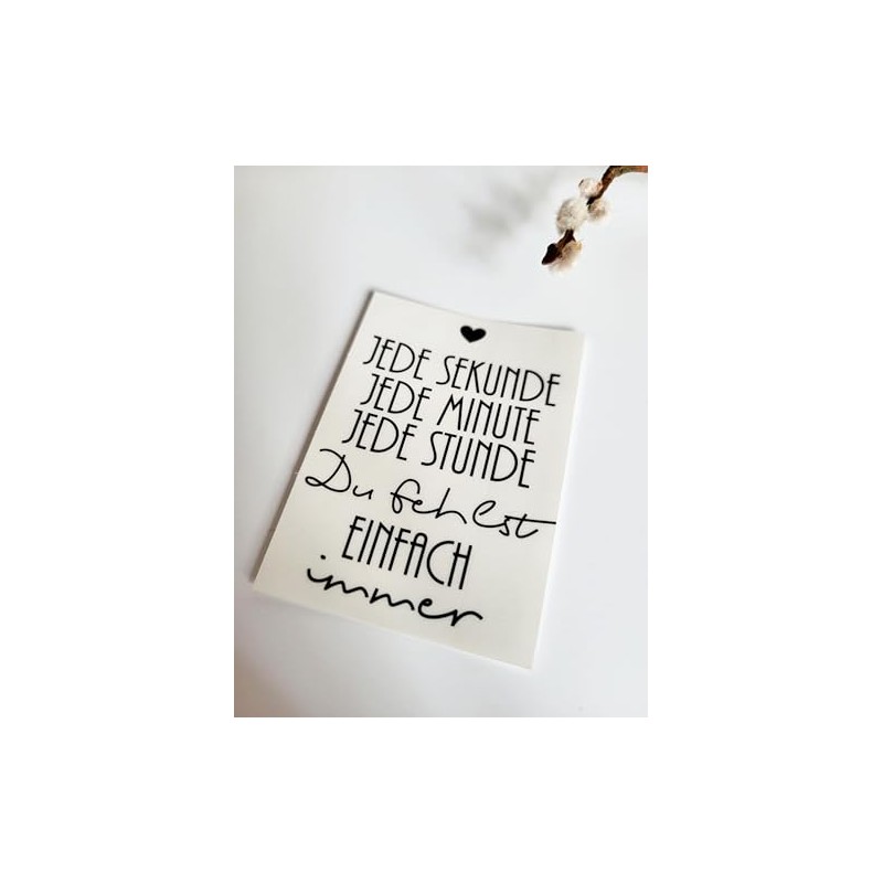 "Diese Worte auf dem Grablichtaufkleber sind ein stilles Versprechen, dass du niemals vergessen wirst. Jede Sekunde, jede Minute, jede Stunde - du lebst weiter in meinen Gedanken und meinem Herzen. Deine Abwesenheit mag schmerzhaft sein, aber deine Liebe wird immer in mir weiterleben." Gestalte einfach, persönlich und modern ein Grablicht. Die Aufkleber sind hergestellt für eine einfache Anwendung auf alle Arten von Grablichtern. Der Sticker "Jede Sekunde, jede Minute, jede Stunde - du fehlst einfach immer" passt an besonderen Feiertagen sowie im Alltag. Achtung: Du erhälst nur den Aufkleber OHNE Kerze. Die UV-Licht Aufkleber sind witterungsbeständig und daher für den AuÃenbereich geeignet. Wähle einfach zwischen einen einzelnen Aufkleber (zum Beispiel als einmaliges Geschenk zu einer Beerdigung) oder wähle das Sparset um deine Grablichter auf dem Friedhof zu gestalten. Jeder Aufkleber ist sorgfältig gestaltet und zeigt ein liebevolles Motiv, das Trost und Hoffnung spendet. Die Aufkleber sind einfach anzubringen und sorgen für ein individuelles Gedenkobjekt. Lass deinen Lichtergruà in den Himmel strahlen. ð¤ MaÃe und Materialien Dein Aufkleber ist 7,4 x 5,2 cm groà / DIN A8 Outdoor: 90µ Haftfolie transparent mit Hochglanz-UV-Lack (witterungsbeständig) ð¤ Was du bekommst: 5 UV Aufkleber OHNE Kerze ð¤ Versand: Da ein Trauerfall nicht planbar ist, erfolgt der Versand einen Tag nach deiner Bestellung. Versendet wird mit der deutschen Post/DHL dauer ca. 2 Tage.