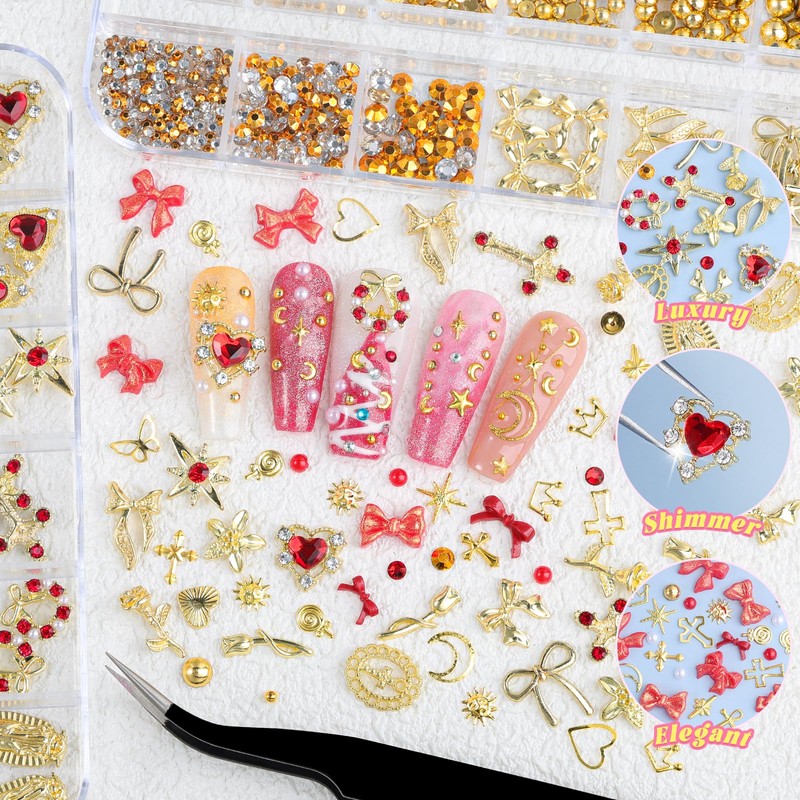 - 【60 Styles Gold Charms Nail Art Kit】5 boxes of sparkling nail accessories to light up your nail art: 1 box gold Y2K nail charms, 1 box red bows and nail rhinestones, 1 box gold half nail pearls & bow stuff, 1 box star and cross nail charms, 1 box nail art beads and studs and 1 tweezers. Assorted nail charms will better meet your daily personalized nail art design.