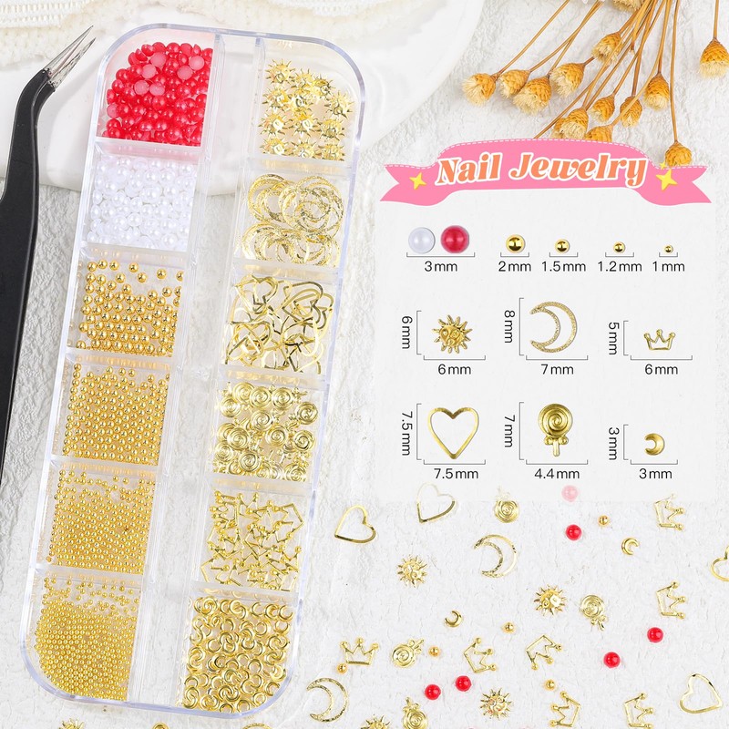 - 【Dazzling Rhinestones & Multisize Pearls】Nail design kit includes red/white/gold rhinestones in 2/3/4mm, gold nail beads in 1/1.2/1.5/2mm, half pearls in 1.5/2/2.5/3/4/5mm for nails. Shimmering nail supplies in various sizes fit natural or acrylic nails. Secure with sealing adhesive for long-lasting sparkle without peeling.