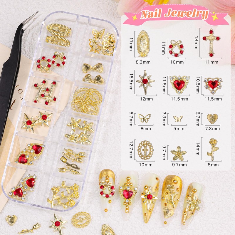 - 【Exquisite Nail Gems and Charms】Gold nail jewels set includes gold crosses and stars in various styles, along with other metallic charms like butterflies, flowers, hearts, bows, crowns, moons, Christmas wreaths and Virgin Mary shapes. Diverse gold nail decorations bring craftsmanship to life, elevating your designs with dazzling luxury.