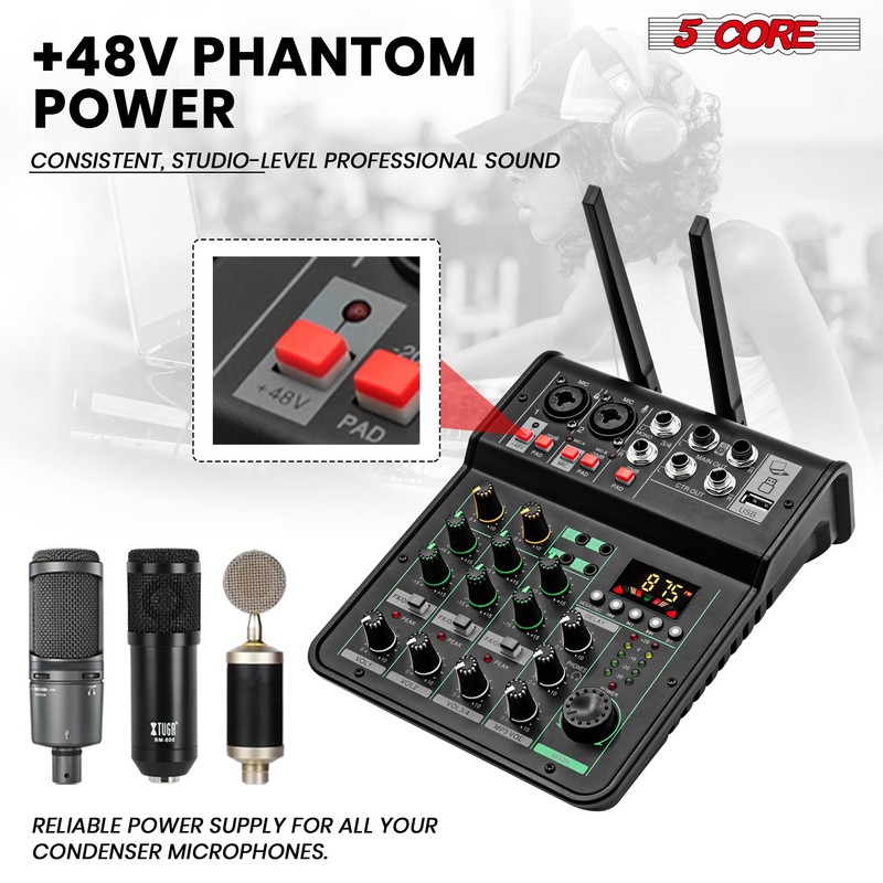 - 𝟰 𝗖𝗛𝗔𝗡𝗡𝗘𝗟 𝗔𝗨𝗗𝗜𝗢 𝗠𝗜𝗫𝗘𝗥 - 2 XLR 1.4" and 2 Mono input. +48V phantom power support condenser microphone