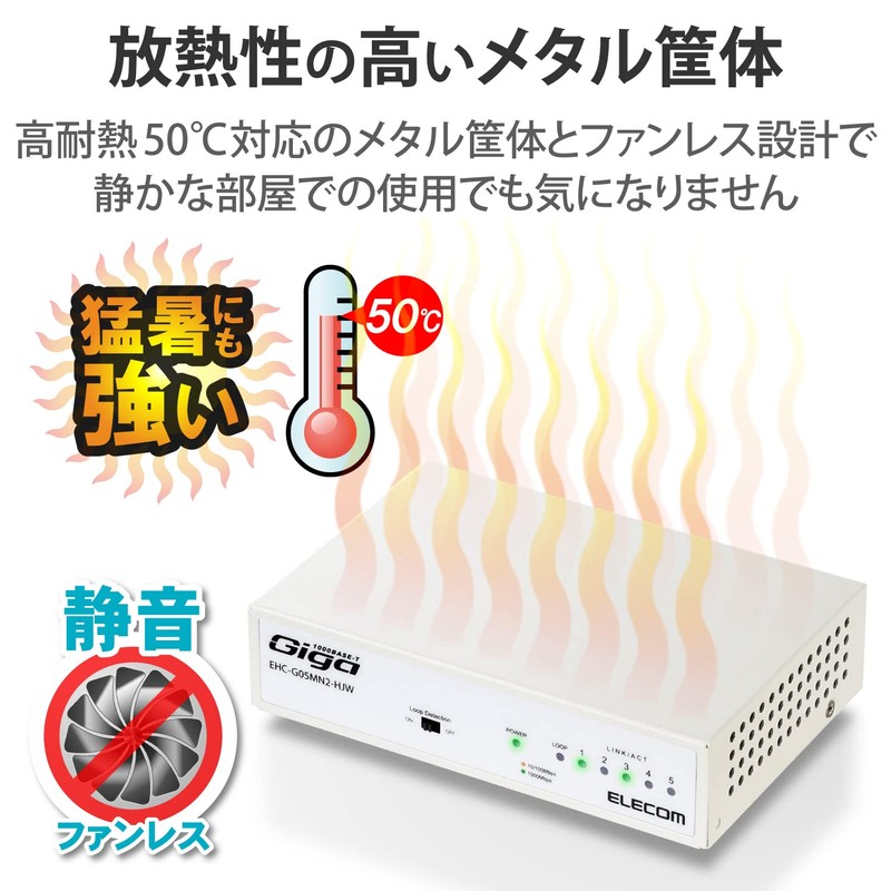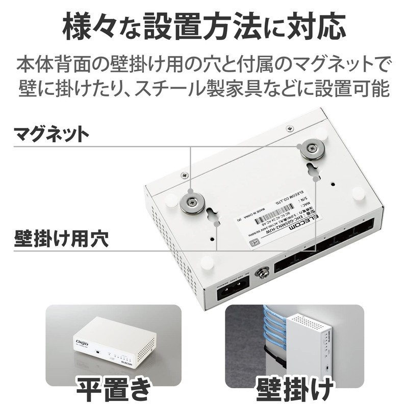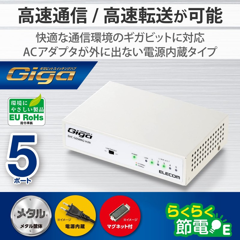 エレコム スイッチングハブ ギガビット 5ポート 金属筐体 マグネット付 電源内蔵 ホワイト EHC-G05MN2-HJW