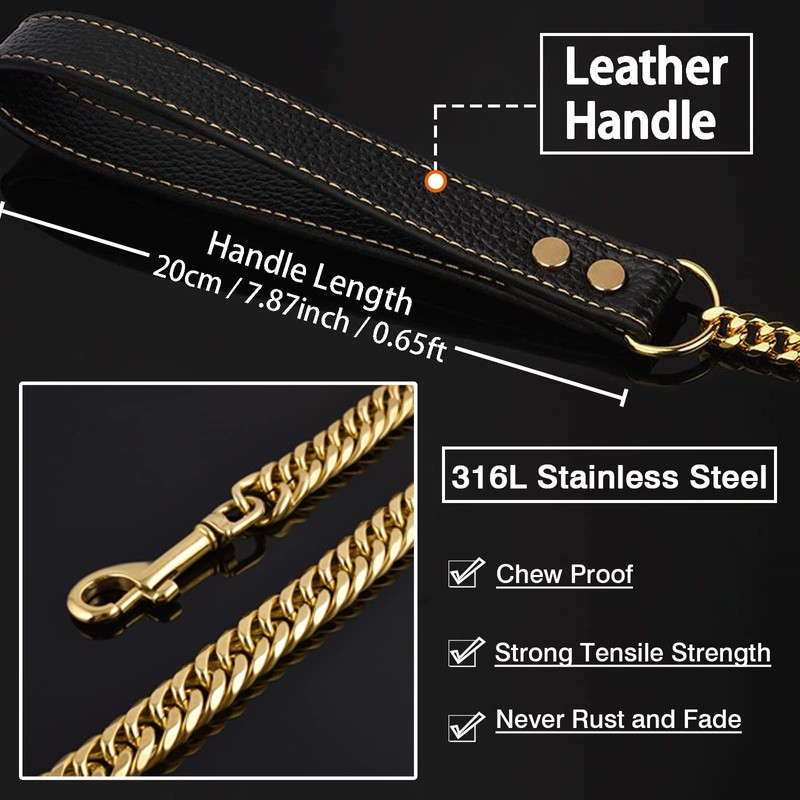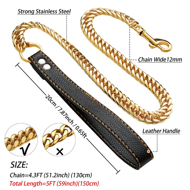 - 【Strong Dog Leash】Made of 316 stainless steel, 18k gold plated gold dog leash.The dog chain leash is fully welded and can withstand a weight of up to 390 pounds. The metal dog leash is high hardness, durable, strong, long service life , and never rust.