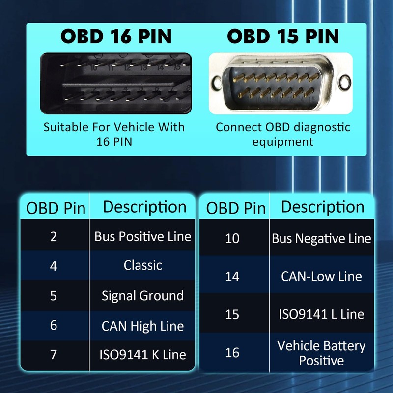 - ▶OBD 2 OBD II connector:15-pin male to 16-pin male OBD2.